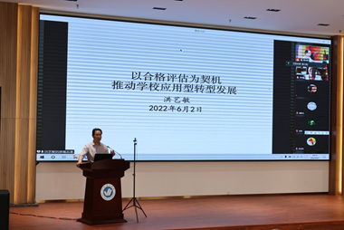 洪艺敏教授以“以合格评估为契机,推动学校应用型转型发展”为主题,围绕“合格评估评什么、专家怎么评、学校推进应用型转型发展的策略”三个方面进行了详实阐述。洪教授指出,合格评估是对高校整体办学能力、办学水平和社会影响的认证。高校要明确评估方针、评估目的,围绕评估的根本任务“一个引导,二个坚持,三个基本,四个促进”为主线,有序开展各项工作。